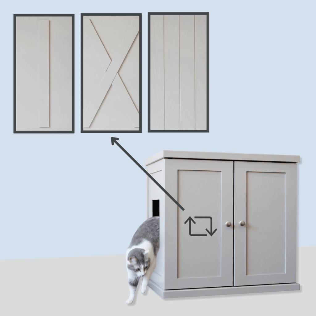 Interchangeable front panels for the Refined Cat Litter Box Deluxe. Easily slide out the panels from your existing cabinet and replace them with the style of your choice.