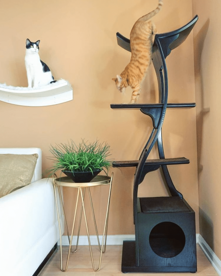 Cats naturally love high places – they are quite happy surveying their kingdom from above – so this is the perfect opportunity to create high spaces for your feline fur baby. You can’t go wrong with a tall cat tree, such as the Lotus Cat Tower from The Refined Feline, which offers multiple places to perch as well as a cushioned den. It is like a work of art for your home and while it is almost 6 feet tall, the base is only 20 inches long on each side so it saves a ton of floor space! Multiple cats can enjoy this modern cat tower and The Refined Feline offers many other types of cat furniture in the same finishes so you can truly catify your entire home without sacrificing your aesthetic.
