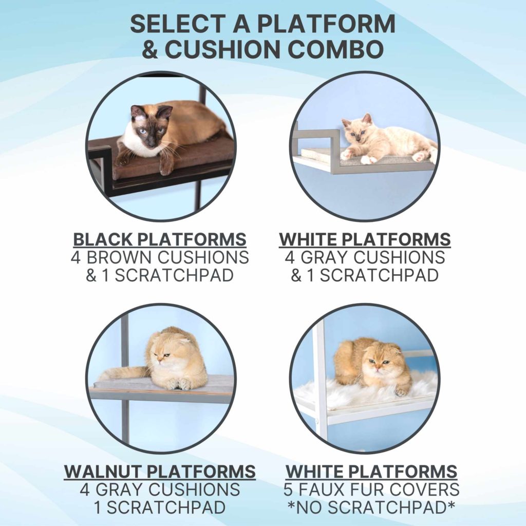 Two types of platform sets are offered: one set with four plush cushions and one scratchpad, or a set with 5 white faux fur pads. You can mix and match the frame color and platform color to your style preference. All platform coverings are removable and washable while the sisal scratchpad is replaceable if worn. Replacement cushions and sisal are available.