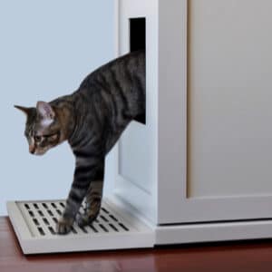 This wood litter catch accompanies the large or xlarge Refined Litter Box from The Refined Feline. Made of solid wood, the slotted design catches litter as a cat exits the litter box. To empty, hold the catch over a litter pan and simply slide trap door underneath.