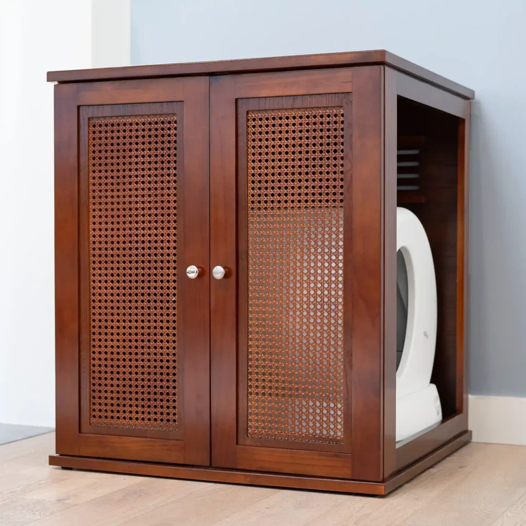 But that’s not where the purrfection of our litter box enclosure ends. A cabinet made with durability in mind, oak veneer overlays a blend of ply and solid wood for supreme odor and moisture resistance. Reversible entryway means you can position the cabinet wherever your cat prefers. Designed for electric litter boxes, our self-cleaning cat litter box cabinet also includes a hole in the back to accommodate power cords.