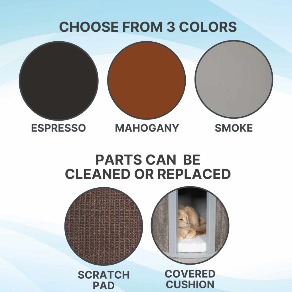 The Purrrrfect End Table is an elegant cat bed for your cat to crawl into and also doubles as an end table or nightstand. Two curved sisal panels provide your cats ample area to claw when they are not nesting inside. The machine-washable cushion gives felines a soft spot to curl up onto for a comfy catnap. If the sisal panels wear or the cushion gets dirty it’s no problem as replacement parts are always available.
